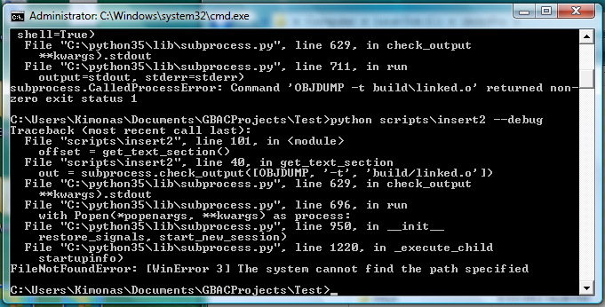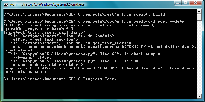 March 8th, 2016 8:16 AMKimonasHey there FBI, could help me with an issue I have? I was following the tutorial you wrote for C, I installed python 3.5, devkitPro and fixed the slashes in the System's Variables. Also the "python scripts\build" command from the terminal works fine but when I hit the "python scripts\insert --debug" it gives me the following errors: